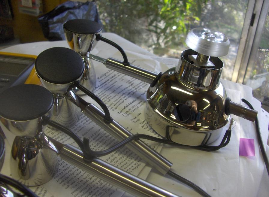 The bulbs are 10W halogens that plug into ceramic sockets that are riveted into the jiggers using rivets I formed from lengths of brass tubing. There was a lot of fiddly small hole drilling through the jiggers since I had to drill 2 holes for the wires, and 2 for the rivets. I also had to avoid drilling out the spot welds that held the jiggers together. The wiring is co-axial 16 gage power cord wire from the surplus store (from a laptop power supply.) I just wanted nice black circular cross section 2 conductor wire that was thick enough. That fit the bill.