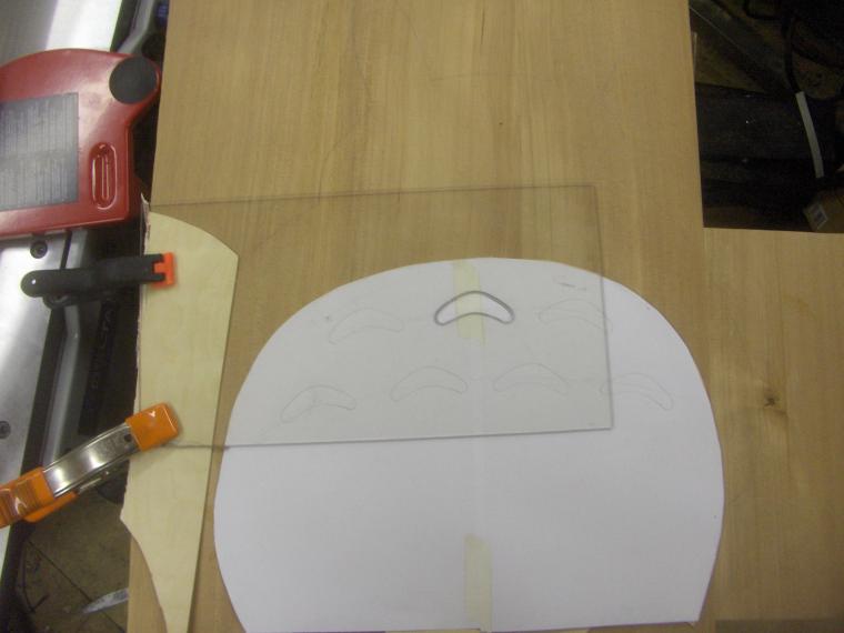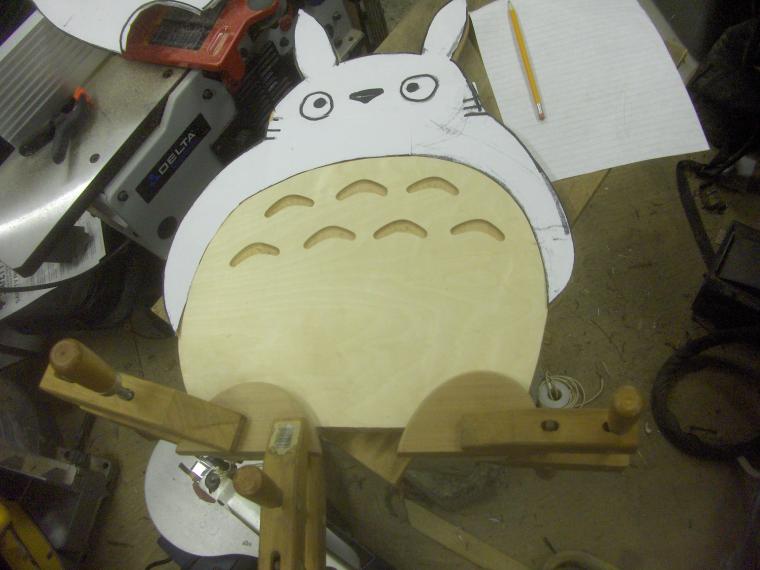 So then I made a router template to cut the chevrons on Totoro’s chest. I did a sketch on paper, cut the outline onto some 1/8″ acrylic sheet, and drilled/filed the shape out. Then I’d clamp that into position for each of the chevrons and routed away. I used a ball end bit, and would do a “once around the outside,” and then a series of evenly space vertical passes to route out the interior. I didn’t want to have to finish the bottoms of those things and I figured that sort of pattern would provide an interesting look that wouldn’t need much touching up.