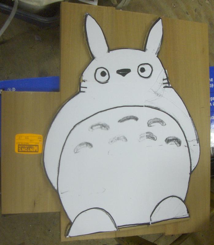 I had originally thought I’d do his belly using some spare white formica that I had left over from a counter top. Then I had this “good” idea. Instead of using formica I could put a light wood veneer on, it would look more natural, and I’d still be able to route through to produce the darker chevrons on Totoro’s chest. I got some veneer and some veneer glue, and I stuck it on. Now it is at this point dear reader that I noticed that the clamping force recommended in fine print on the glue’s label was something like 200 lbs per square inch! Now that was going to be something like 14 TONS of clamping force. I started to get a bit worried. I noticed that the piece’s shape made it hard for me to get clamps to reach many of the edges of the veneer. I worried more. I put the board on the shop floor with a board over it, and then piled layer after layer of concrete block on top of that. Still probably had less then half a ton total on the board. Not good. The next day I unpiled the stack only to discover that the veneer had rippled horribly. I had to sand it all away again using a 60 grit pad. Tediously back to square one.