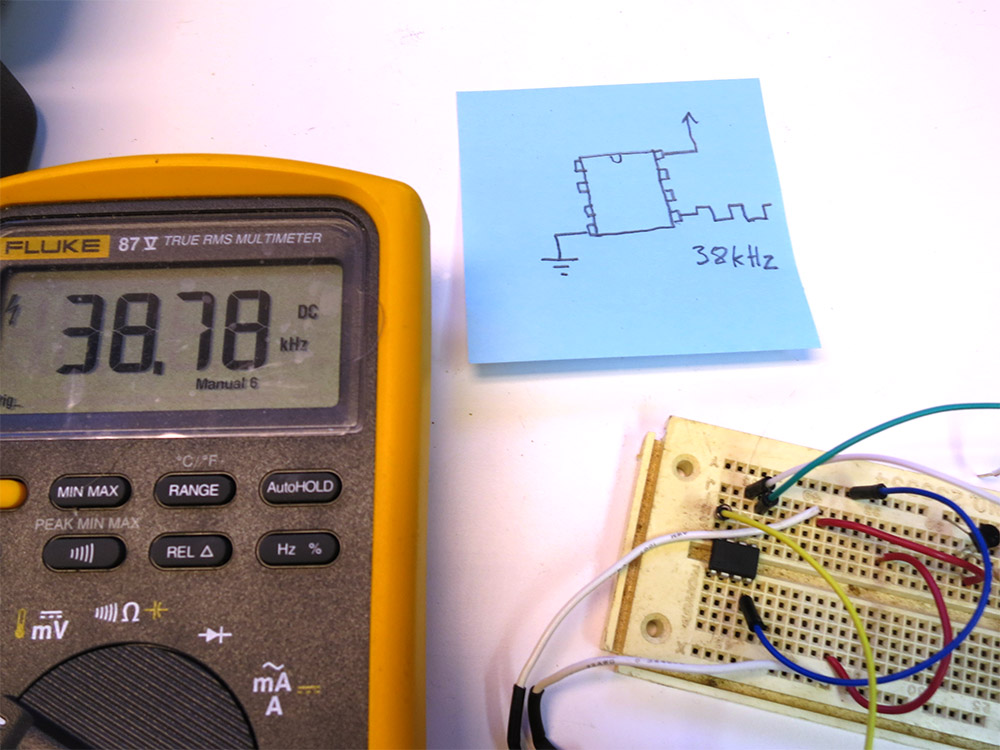 It wasn’t until the next weekend that I got a chance to try to run some code on the chip.   For the cat door project I need a 38khz signal to drive the Infrared LED.   That is because the IR receiver filters out all non 38khz signals so it can reject ambient light level changes and all kinds of other noise in the signal.   This is how pretty much all IR remote controls work and that’s why you can get a fancy receiver that does all the filtering for  cheap. Be careful when choosing a receiver module. Since they are used for IR data transfer, many of them can’t handle continuous 38khz signals.   If you just go get the receiver at Radio Shack, you’ll have to use bursts of 38khz to keep the receiver paying attention. That’s code complexity I’d like to avoid.