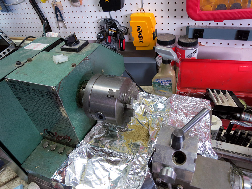 protectingLatheFromWoodI hate turning wood on my metal lathe.   Sawdust and sanding grit can get into everything. The sawdust wicks away oil and the grit can embed into precision mating surfaces causing them to wear quickly.  To avoid this problem, I cover most of the dust-sensitive bits with aluminum foil.  This makes clean up a lot easier.