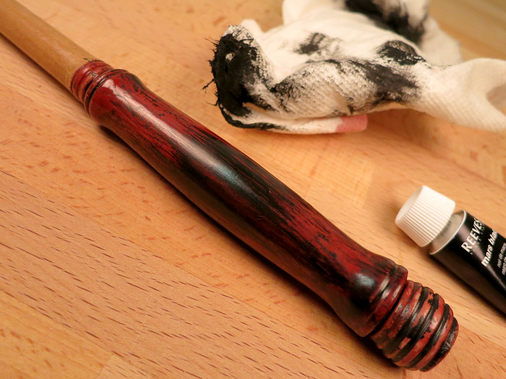 simonWandFauxFinishI used red finish on the handle and clear on the body of the wand.    I wanted to make the wand look old.  I thought I could do that by just dabbing some black acrylic paint on, but since I’d never done that before, it was a little bit intimidating.   What if it looked awful?  I took a deep breath grabbed a paper towel and started dabbing.   I had to work fast because that stuff dries quick.   I dabbed and dabbed and eventually got it to something I was happy with.