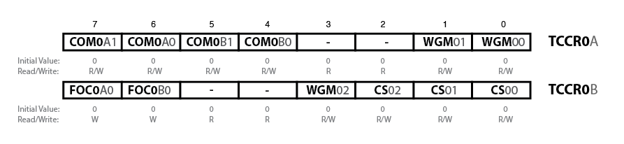 To set up the timer, there’s really only 3 bytes you have to fiddle with: two Timer/Counter Control Registers and the Output Compare Register ,which is the 8-bit number the counter compares against.  To have the counter run in a retriggering loop and have it toggle the output pin A each time it matches, I only really need to set these bits, and only two of those are non zero.