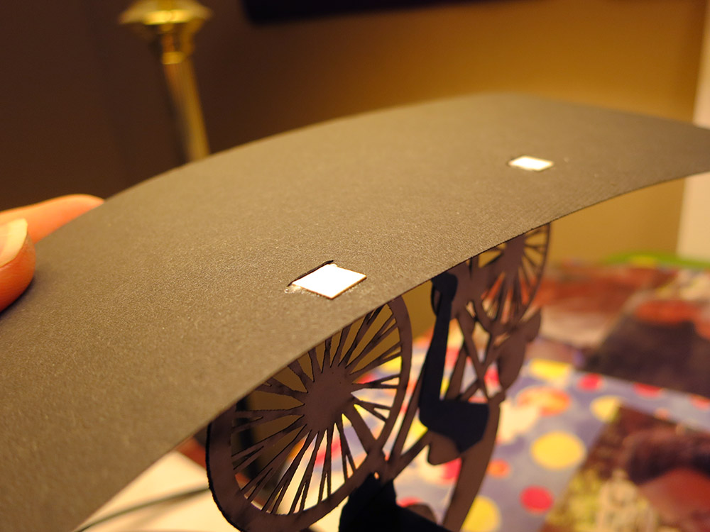 The exact positioning was somewhat improvised since I had had to rush the design and wasn’t able to spare much time for the actual mechanism. If I’d had another 30 minutes, I could have laid out slits in the road/background that would have hidden the various glue tabs and made the positioning exact. I would definitely do that next time.