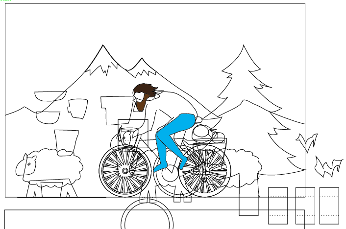 The first thing I did was a quick sketch of the idea in my notebook. I put in a mountain, some foothills, a tree, my uncle on his bike, and a sheep. I figured that would be enough layers to give the final project some depth without having to design too much stuff. I also did a quick diagram of the various depths of the things and the road my uncle would be biking on.