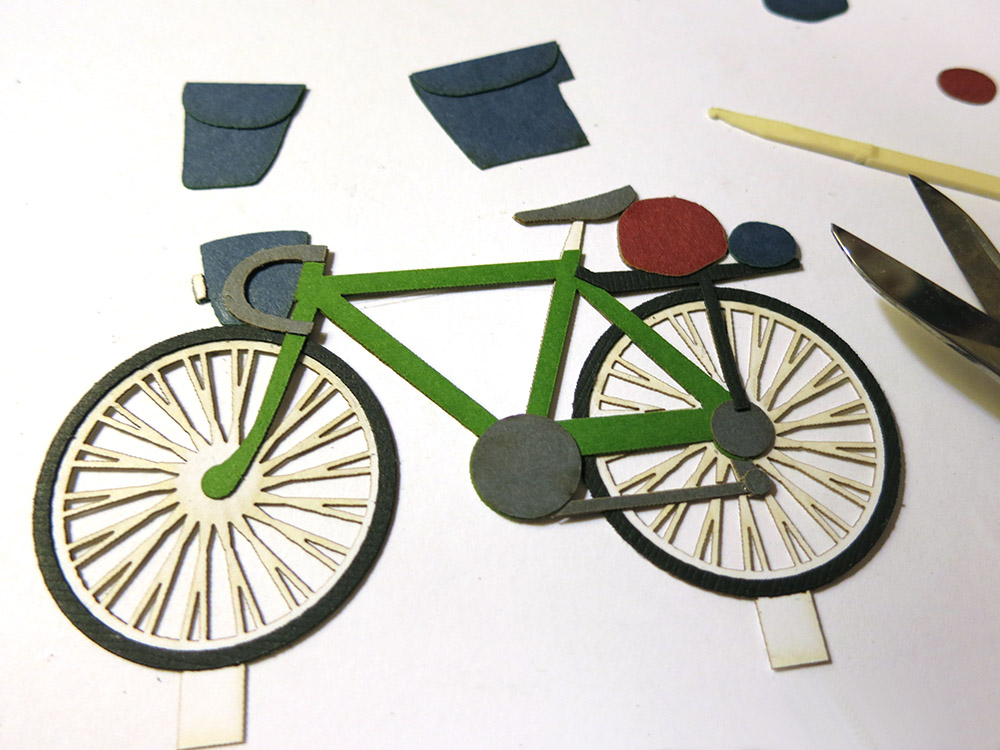 At this point, I needed to make some decisions about glue. In the past, I’ve used 3M’s Super 77 spray glue for paper, which works well, but doesn’t give you much chance to position parts once they’re in contact. So that was out. I’d used decent quality glue sticks, but those were far too blunt an instrument for something like my super tiny bike tires. Strike two. I’ve used white glue for some fairly stiff card stock, and although it is very strong and has a decent working time, it causes wrinkling if you use it on a larger area. I had to figure out something else.