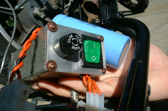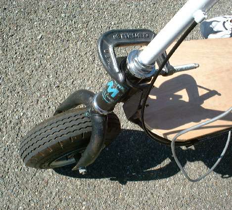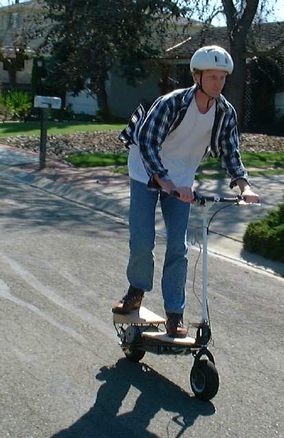 stuck some batteries in, and wired a switch to the handlebars. No brakes, no speed control, but it was time for a test run. I climbed aboard and I was off. After a little bit of use the power switch welded itself shut, and I found myself abord a runaway scooter with no brakes!
