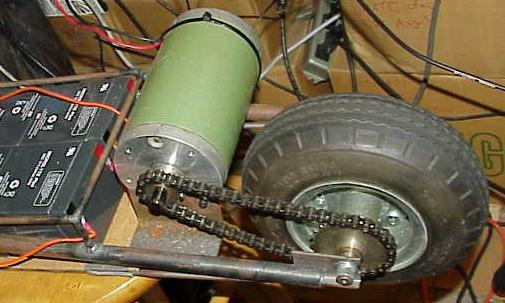 I drew some sketches and decided on an approximate size. Then it was off to the surplus stores to find a suitable motor. The motor would dictate most of the rest of the design. I spent a day digging through various piles of grubby motors looking for a DC motor with enough torque. I finally settled on a 50v motor which had started life as the spindle motor for one of those ancient reel-to-reel tape drives for computers in the 60’s. I also picked up two wheels, some sprockets, and some matching bits of chain. I decided I could run the motor at 48v from 4 12v lead acid batteries.